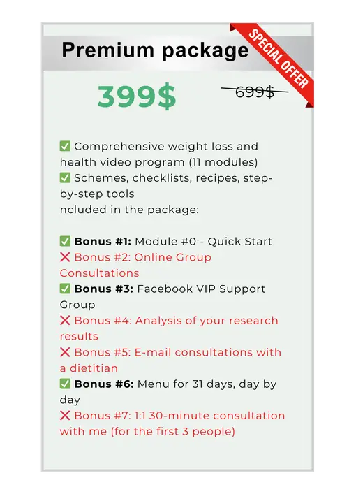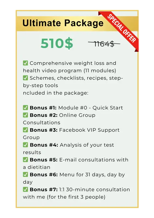 One of the most valuable bonuses. It’s like having personal coaching, but online. You send an email with any question, and the dietitian will respond within 24 to 48 hours. This will help you achieve faster results and remove any obstacles on your path to health and a great body!