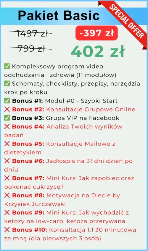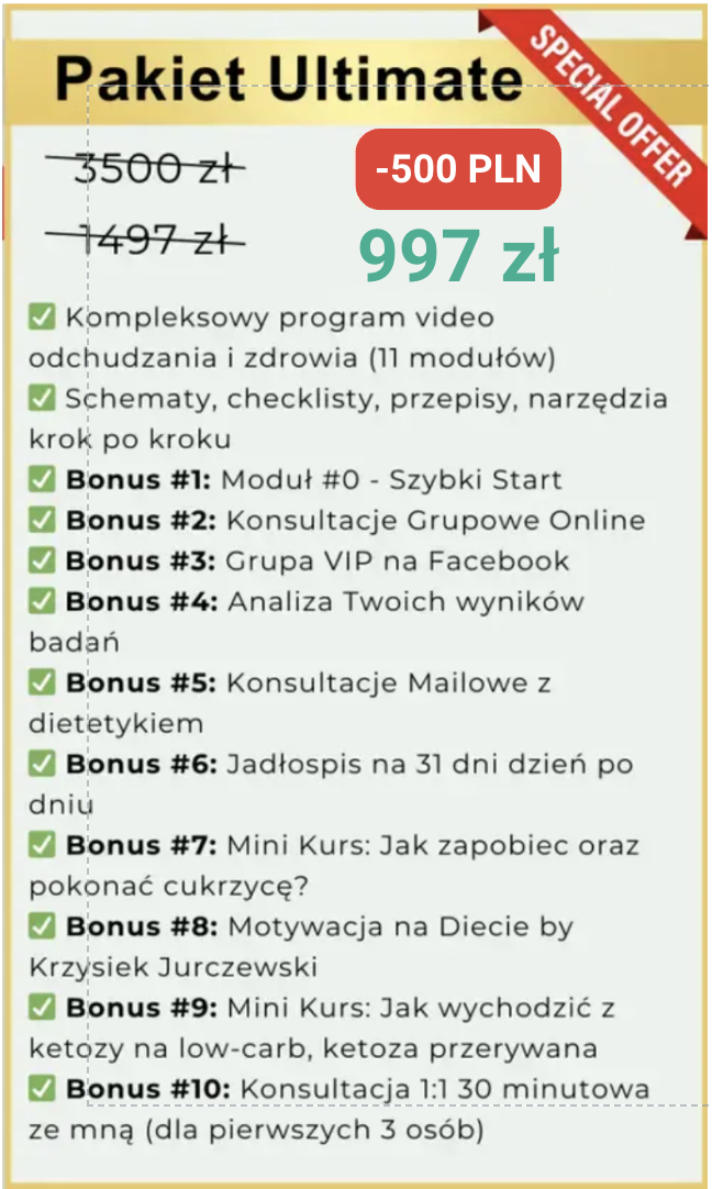 Kurs w formie dodatkowego modułu, podobnie jak moduł szybki start. Powie Ci wszystko co musisz wiedzieć na temat cukrzycy. Jak do niej nie doprowadzić, jak się przed nią zabezpieczyć, jak ją zdiagnozować oraz także jak ją pokonać i odwrócić jeśli takową posiadasz. Świetny bonus, który wielu osobom może uratować zdrowie a nawet życie.